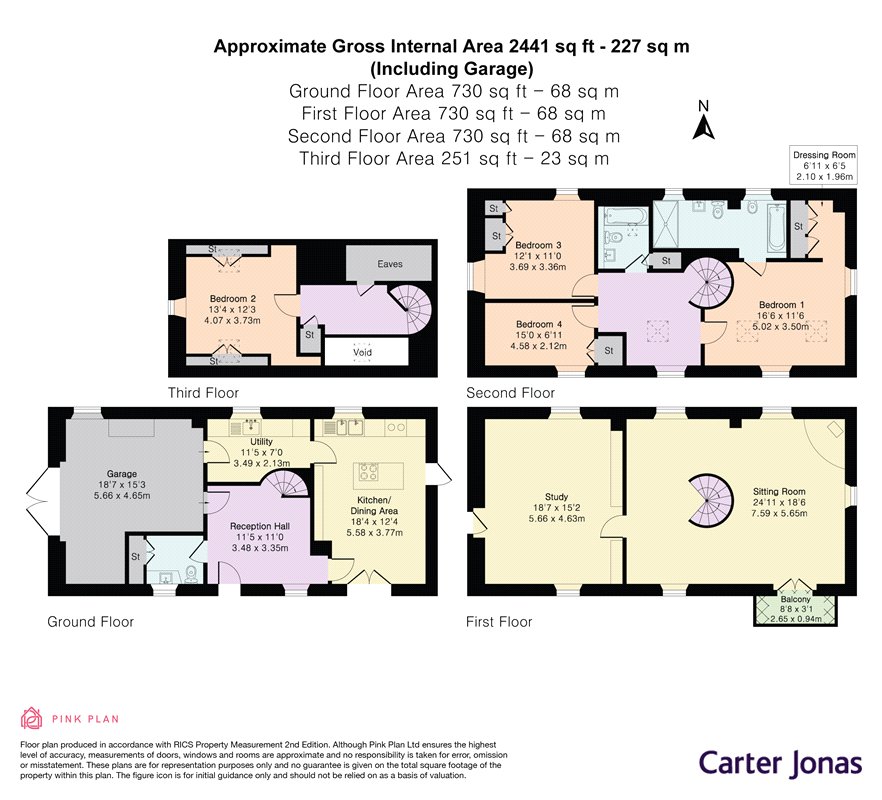 The second floor hosts the vaulted principal suite, complete with exposed beams, a dedicated dressing area with integrated wardrobes, and an en suite bathroom featuring a freestanding roll top bathtub and a separate walk in shower. Two additional bedrooms and a family bathroom complete this level. On the third floor, a further versatile bedroom is accessed via a vaulted galleried landing.